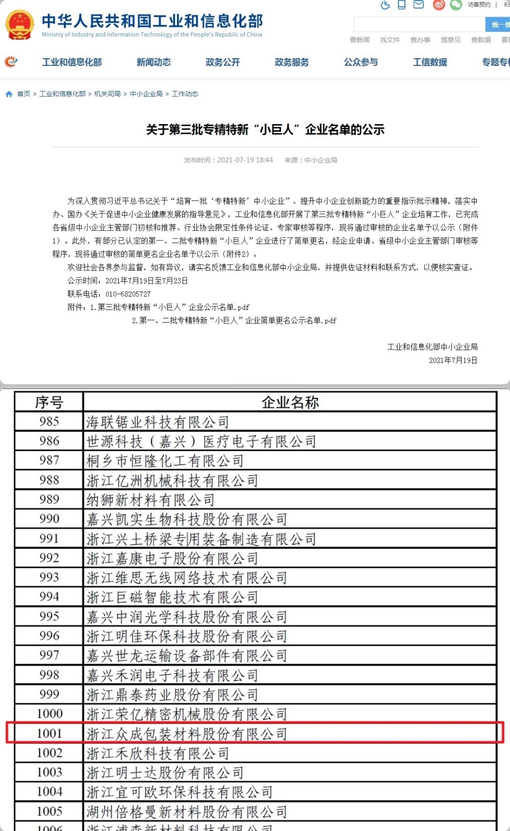 近日,工业和信息化部公布了第三批国家级专精特新“小巨人”企业公示名单,我公司位列其中,成功入围,成为嘉善首家入围企业。